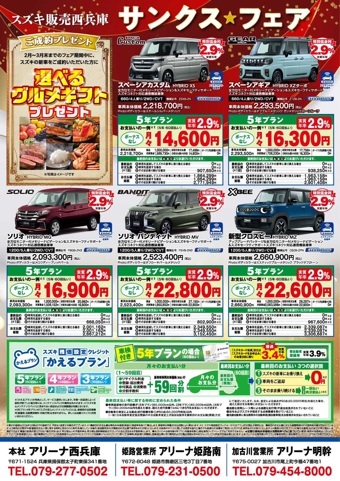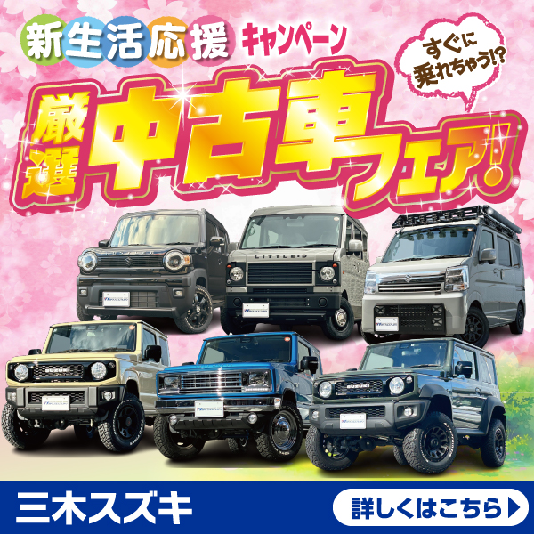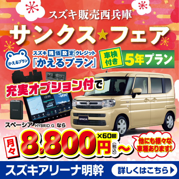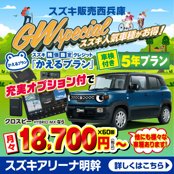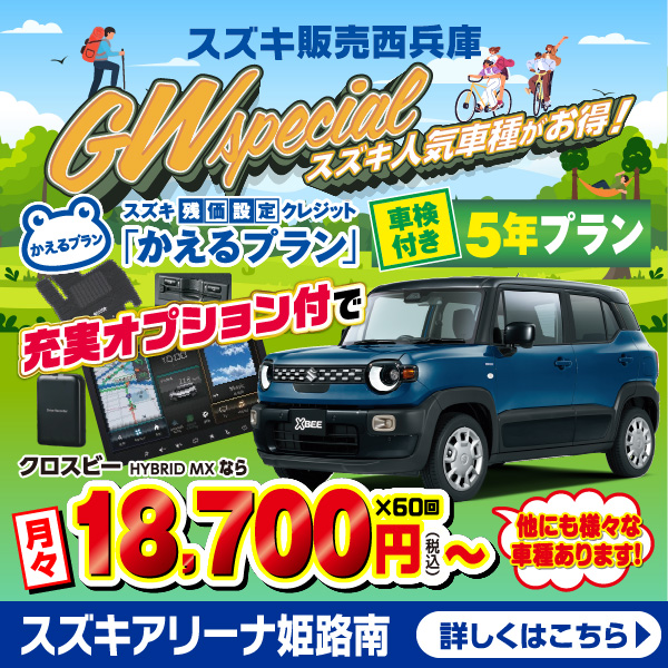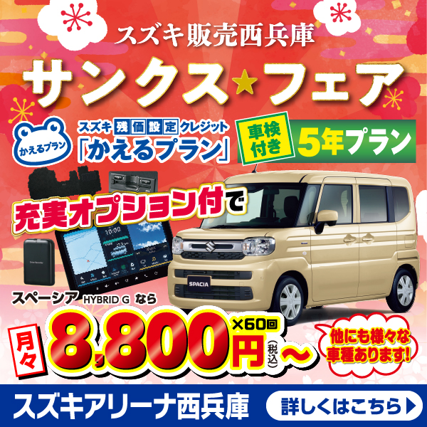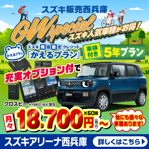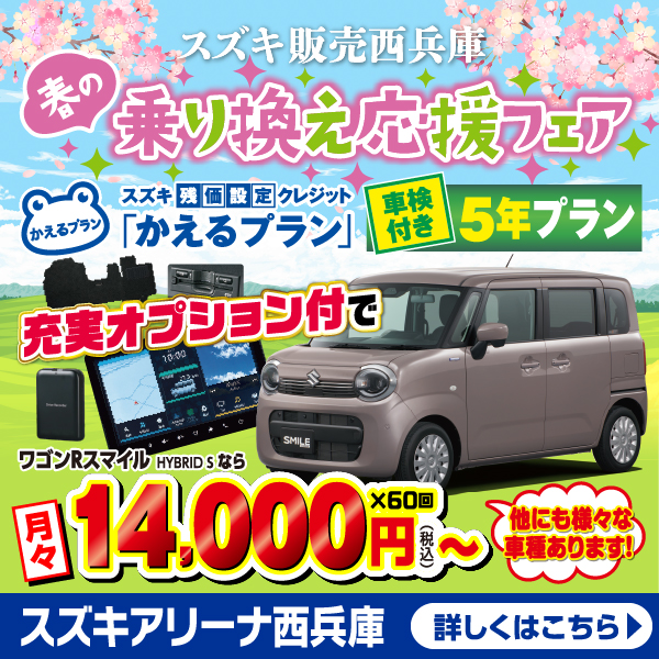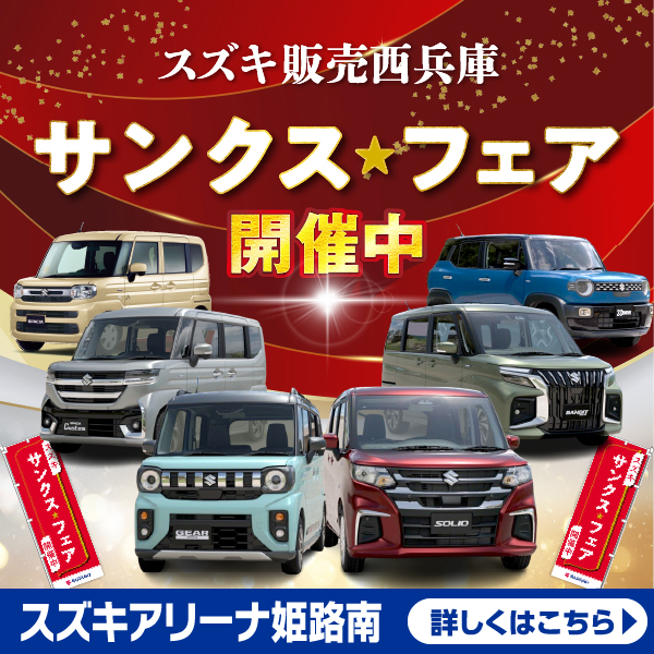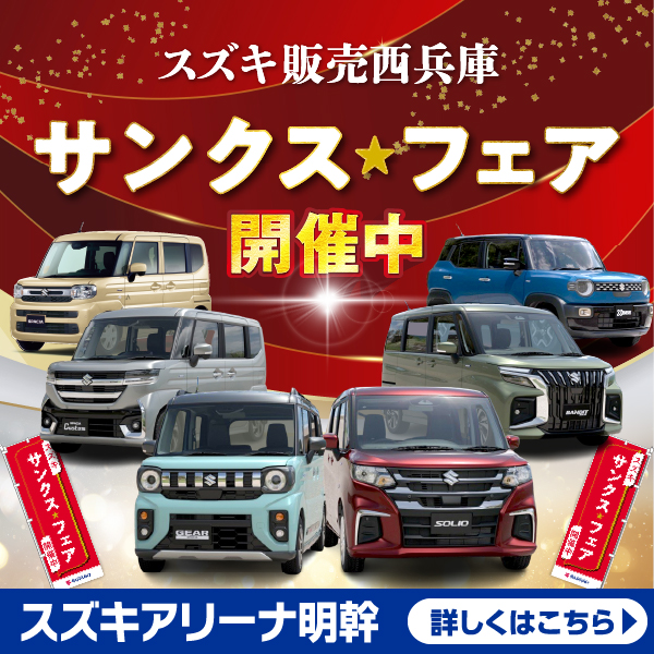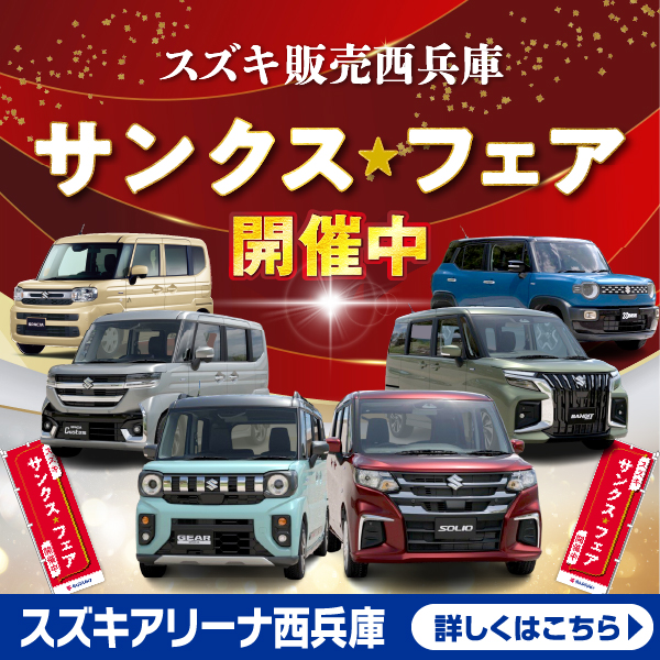 兵庫のスズキのお車販売店とスズキ販売西兵庫がお客様に身近な車屋さんとしてお車の整備のご相談から 買い替えのご相談、買い替え時期にどんなお得なキャンペーンがあるかを配信しております。